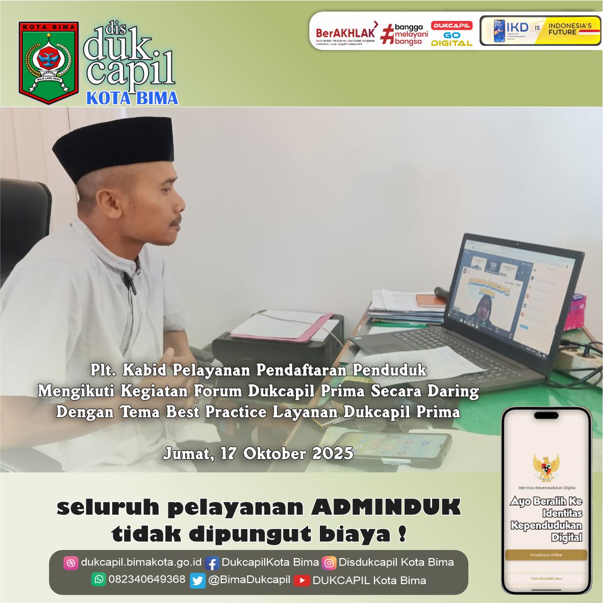 Plt. Kabid Pelayanan Pendaftaran Penduduk Mengikuti Kegiatan Forum Dukcapil Prima Secara Daring, Dengan Tema Best Practice Layanan Dukcapil Prima. Jumat, 17 Oktober 2025.