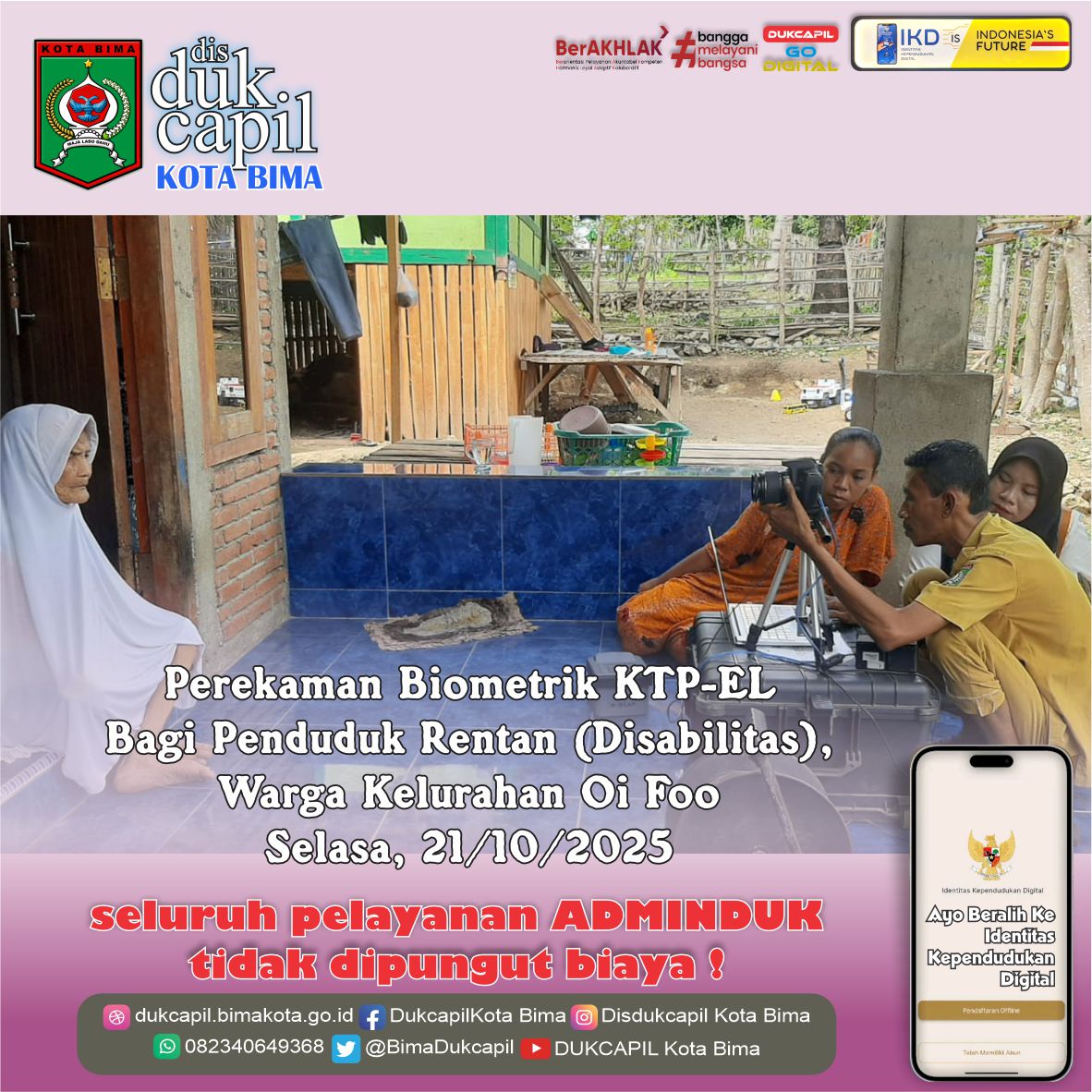 Perekaman Biometrik KTP-EL Bagi Penduduk Rentan (Disabilitas), Warga Lingkungan Sarinci Kelurahan Oi Foo. Selasa, 21/10/2025.