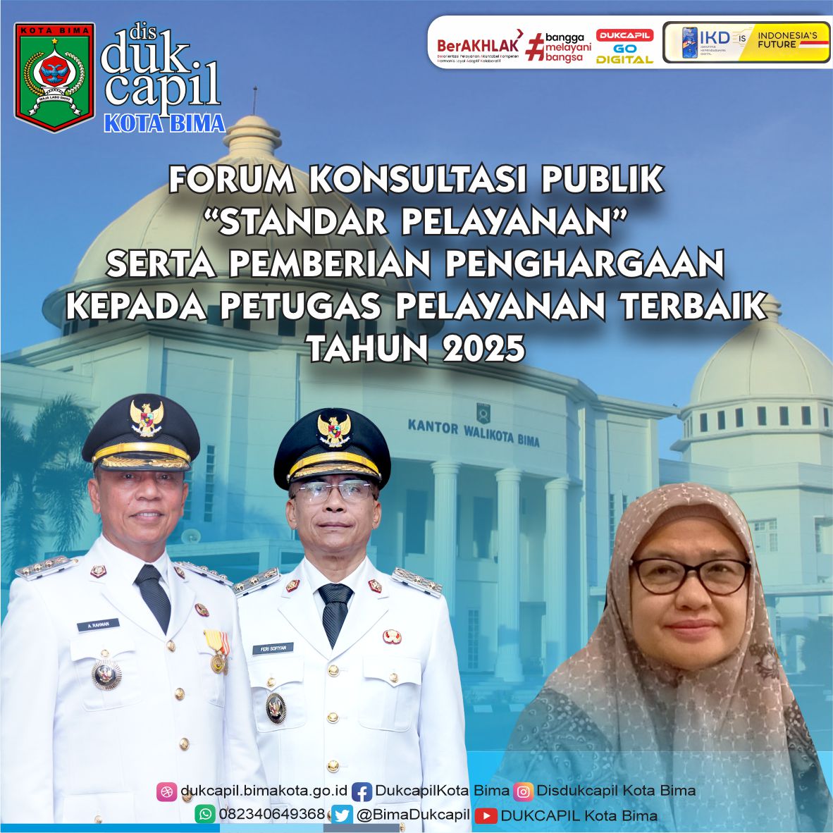 Dinas Dukcapil Kota Bima menyelenggarakan kegiatan Forum Konsultasi Publik Serta Pemberian Penghargaan Kepada Petugas Pelayanan Terbaik Tahun 2025. Kamis 30 Oktober 2025.