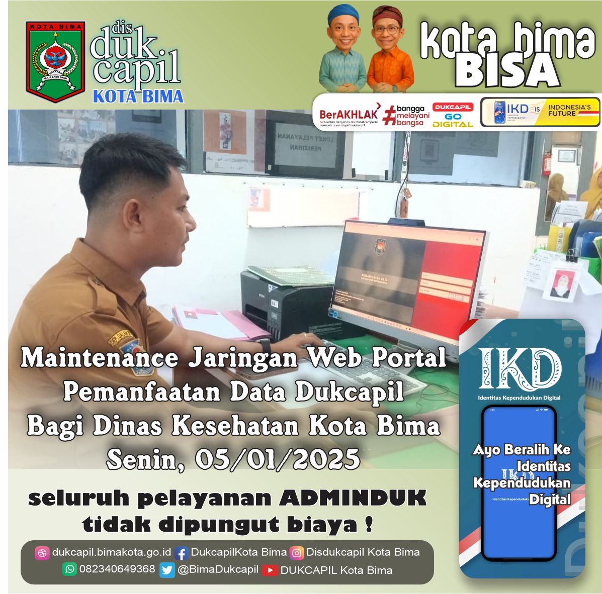 Maintenance Jaringan Web Portal Pemanfaatan Data Dukcapil Bagi Dinas Kesehatan Kota Bima. Senin, 05/01/2025.