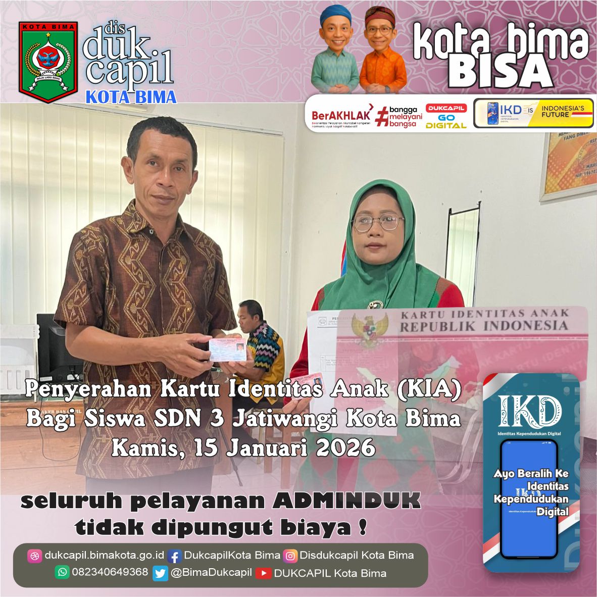 Penyerahan Kartu Identitas Anak (KIA) bagi Siswa SDN 3 Jatiwangi Kota Bima, Kamis 15 Januari 2026.
