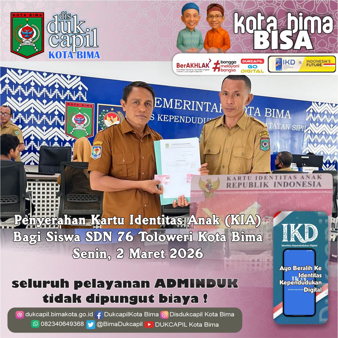 Penyerahan Kartu Identitas Anak (KIA) Bagi Siswa SDN 76 Toloweri Kota Bima. Senin, 2 Maret 2026.