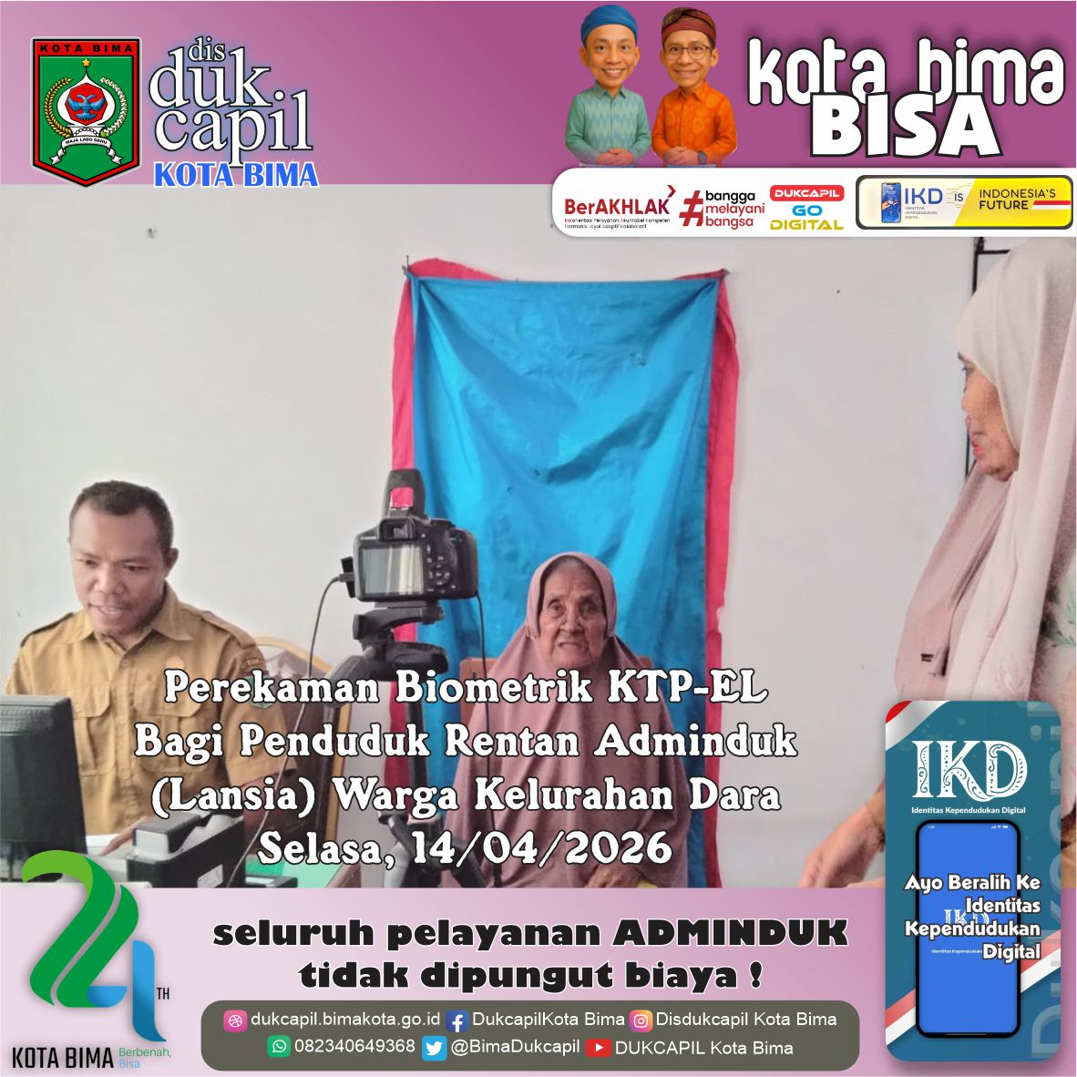 Perekaman Biometrik KTP-EL Bagi Penduduk Rentan Adminduk (Lansia) Warga Kelurahan Dara. Selasa, 14/04/2026.